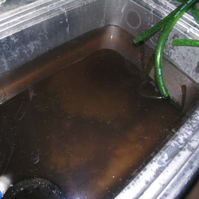 フィルターパッドを水で洗い流す。ちょっと待った。何だこの汚水は!この臭いと真っ黒な汚れ。