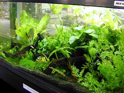 (おお・・後ろからがポイントなのでチョッピリ難しい・・・)ベースになる水草の植栽で完了・・レヨンベール風水草レイアウトは
