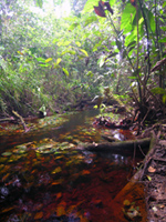 次に、 Cr ・ Kee の所へ直行する。いきなり雨が降り出して、みんな裸で採取することに。採取後雨が止んだので、すかさずビデオカメラを取りに行き、佐々木氏と上野氏のヌードショット。カメラマンの私は恥ずかしいので映していない。ここの水も持ち帰り計測するがここも