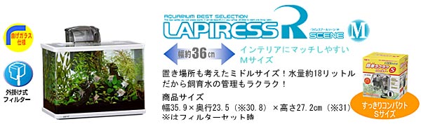 GEX 曲げガラス水槽セット ラピレスRシーン は、透明感のある高級曲げガラスを使用した簡単・お洒落に飼育を楽しめるスターターセットです。ゆったり魚を飼えるサイズからインテリアにちょうど良いサイズまであります。