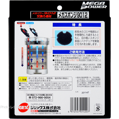 メガパワー9012用交換ろ過材メガスポンジ9012は飼育水のゴミや残餌などを物理的にろ過すると共に、目の荒いスポンジ表面にバクテリアを繁殖させ汚れを分解します。飼育環境にもよりますが、メガスポンジの交換は1ヶ月に1回を目安に交換されることをお勧めします。