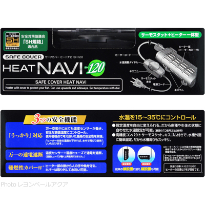 セーフカバーヒートナビSH120は、水容量約48L以下の水槽に最適な安全カバー付温度調節型SHオートヒータです。