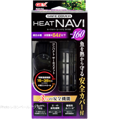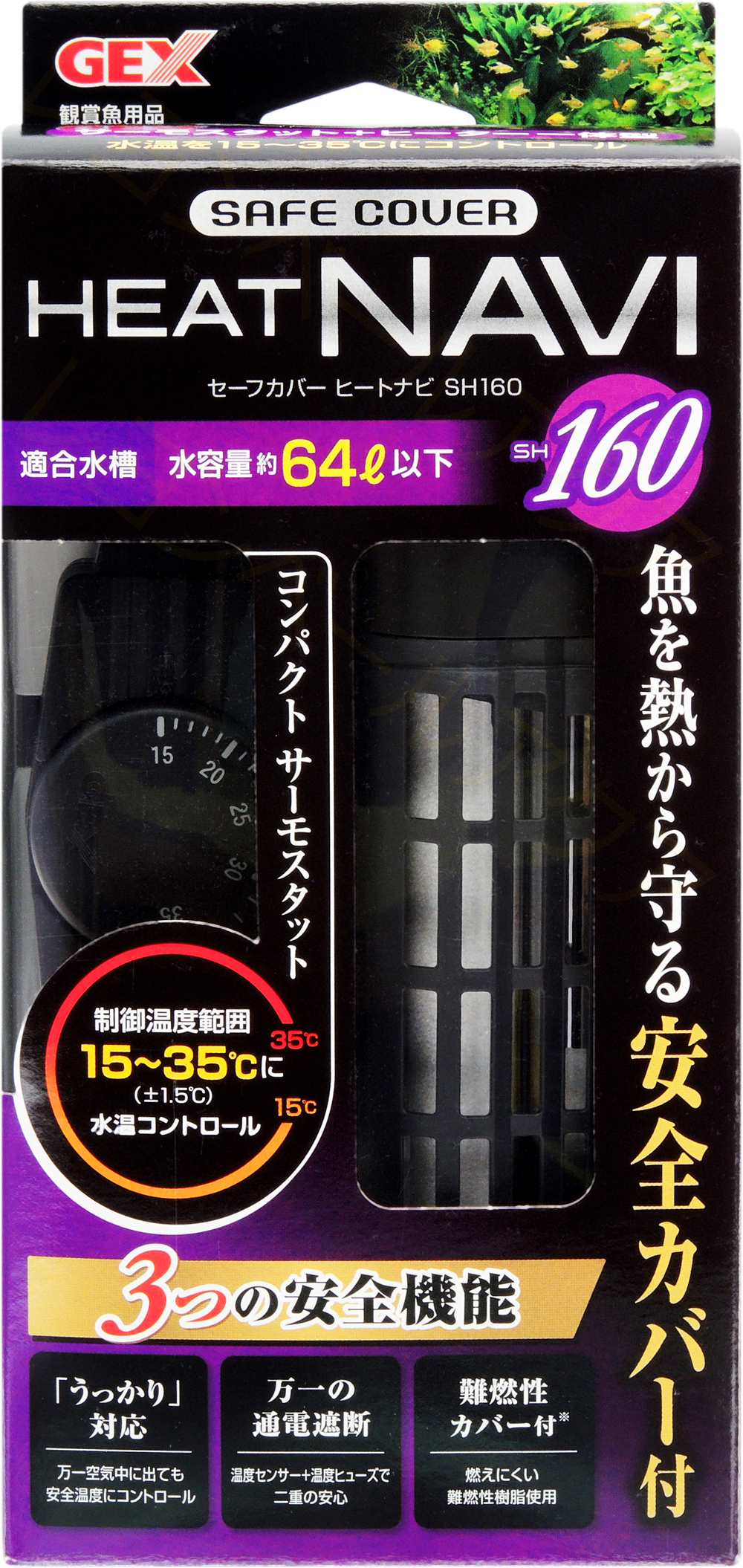セーフカバーヒートナビSH160は、水容量約64L以下の水槽に最適な安全カバー付温度調節型SHオートヒータです。