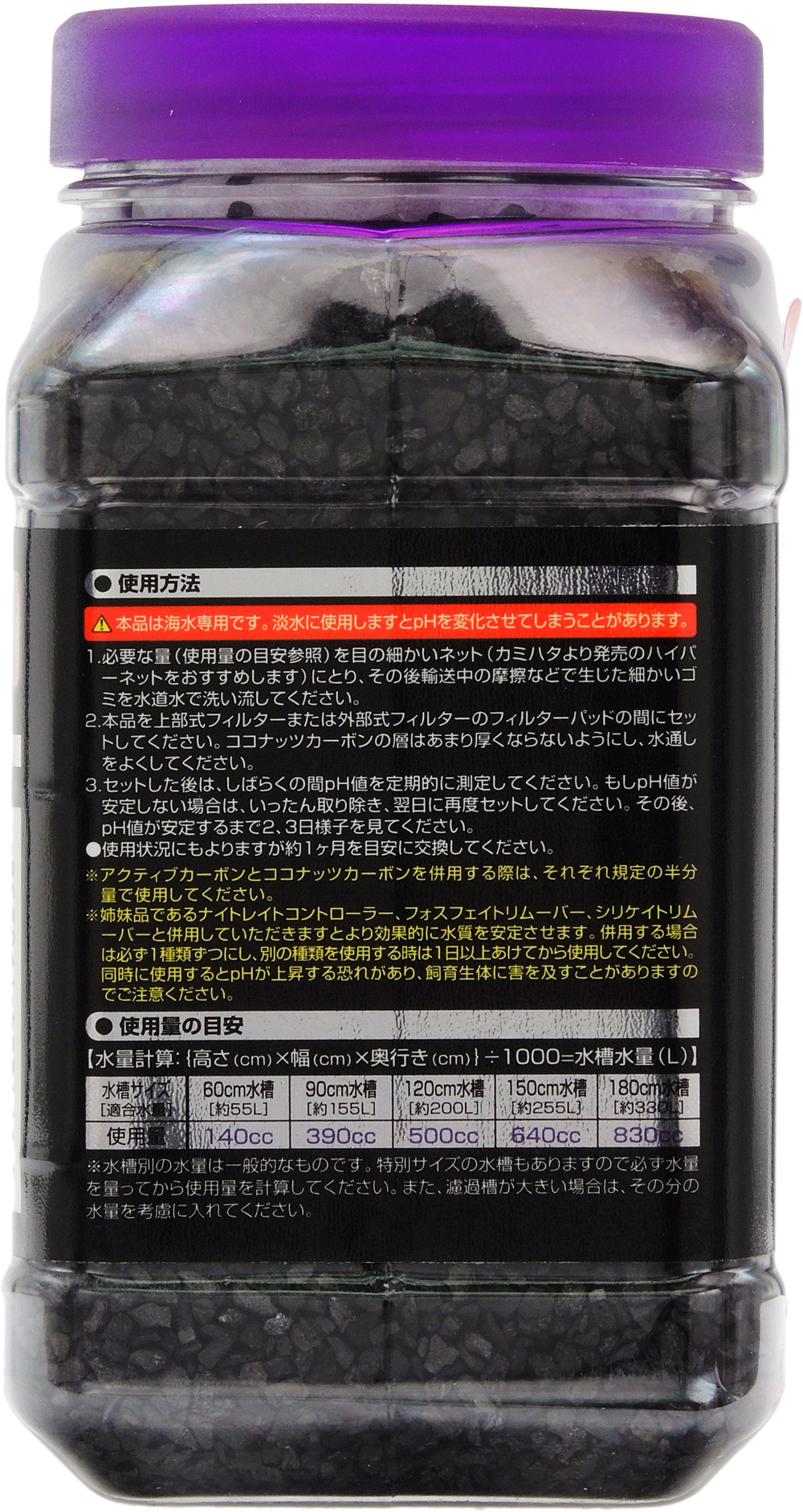 コケ・藻類や有害物質の発生を抑え、魚たちやサンゴ類が元気になるきれいな水に。 有害な重金属・フェノールタンニンを速効で除去します。 ●表面積が大きく、吸着作用に優れたカーボンと高品質のヤシ殻をブレンド。 ●水槽内生物のストレス・病気を予防し、水槽の黄ばみを抑制。