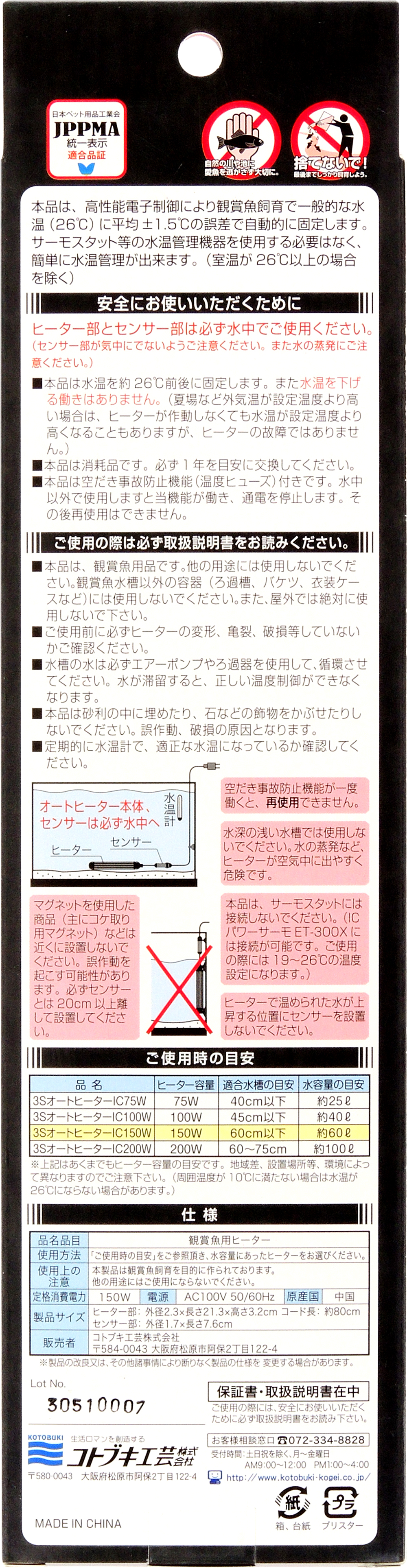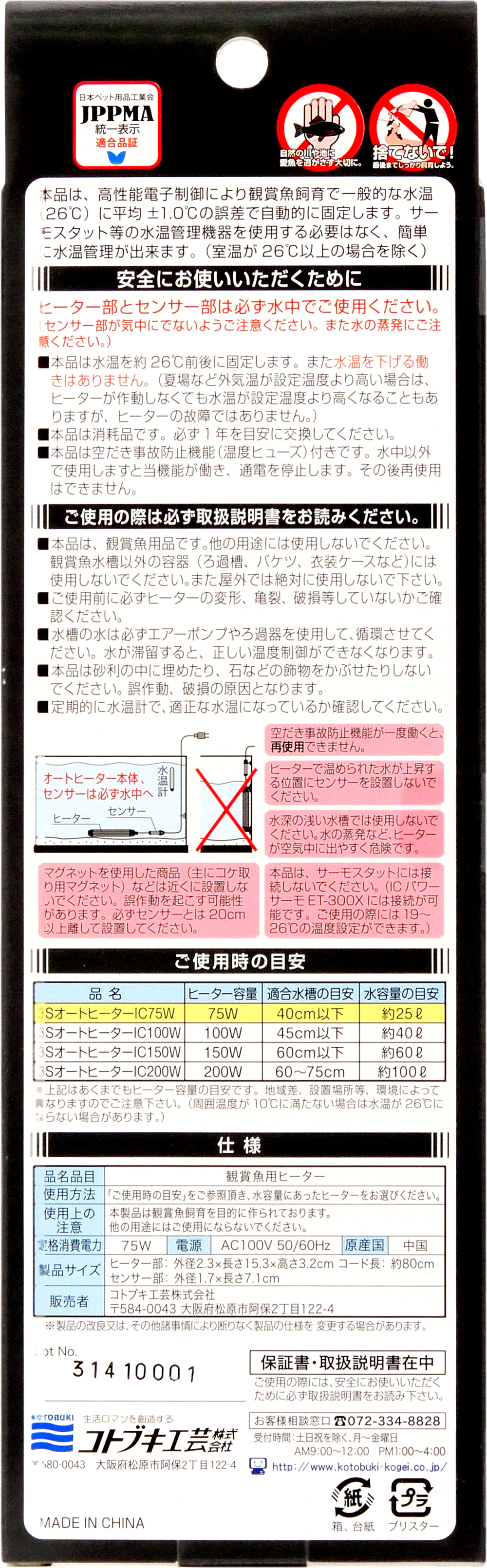 | 商品名 | 3SオートヒーターIC 75W | 3SオートヒーターIC100W | 3SオートヒーターIC150W | 3SオートヒーターIC200W |