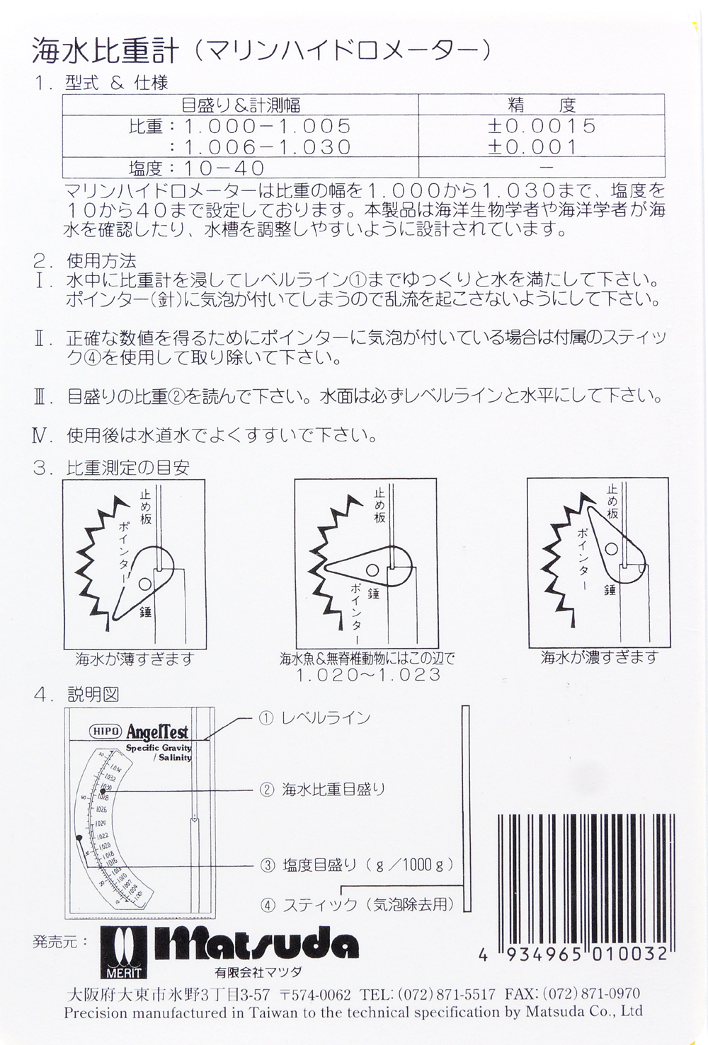 マツダの『マリンハイドロメーター エンジェルテスト』は、比重の幅を1.000~1.030まで、塩度を10から40まで測定できます。
