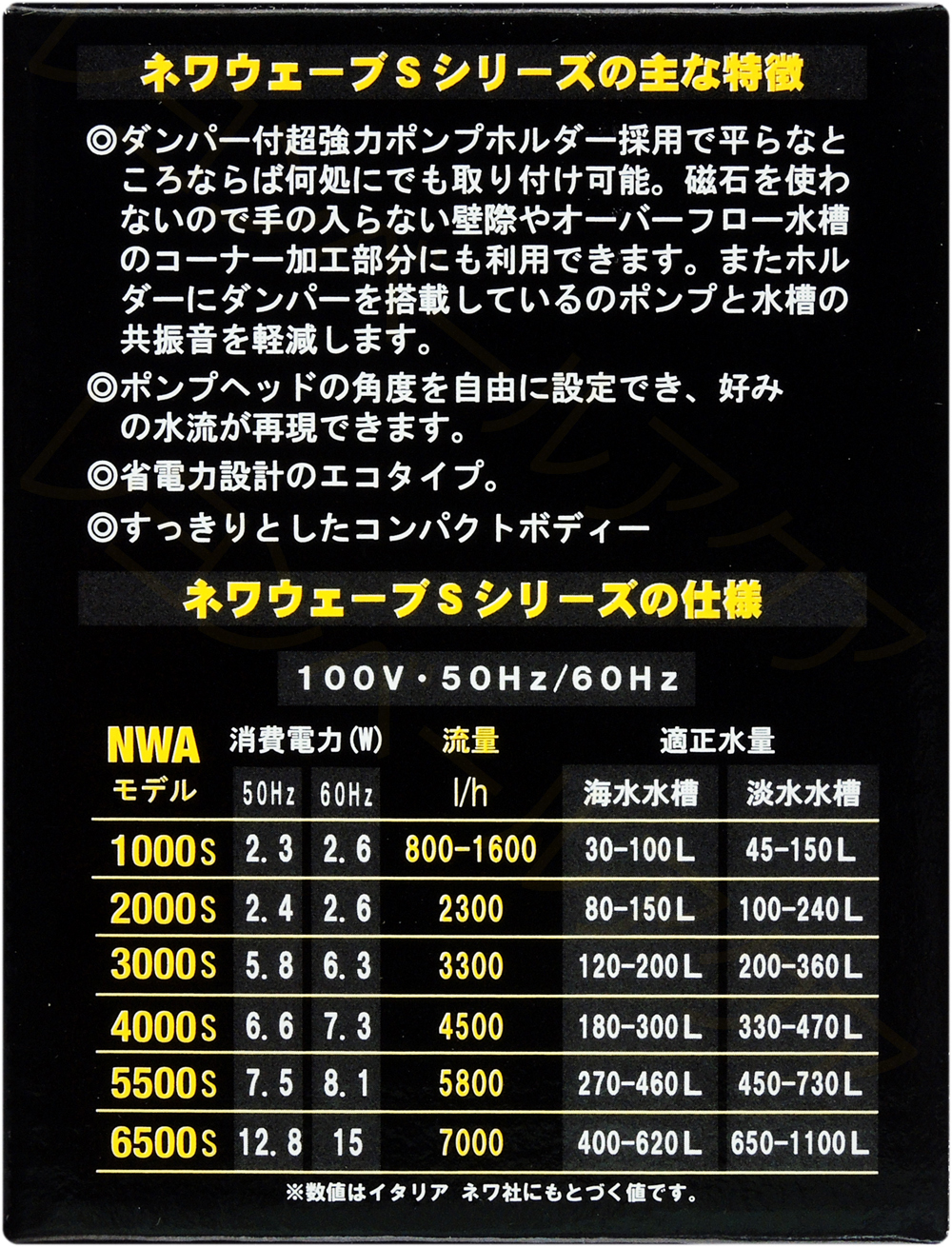ネワウェーブNWA5500Sは流量5800(L/h)適応水槽270L~730Lの水流ポンプです。