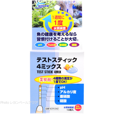 1本のテストスティックで水質管理に役立つ「PH」「アルカリ度」「亜硝酸」「硝酸」の4項目を同時測定できる水質検査紙です。