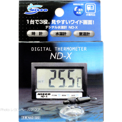 「デジタル水温計ND-X」は、水温と室温を測定でき、便利な時計機能もついた外置式のデジタル水温計です。