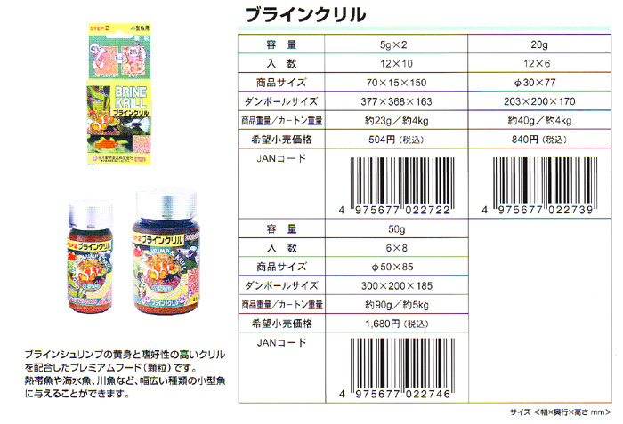 ブラインシュリンプの黄身と嗜好性の高いクリルを配合したプレミアムフード(顆粒)です。 熱帯魚や海水魚、川魚など、幅広い種類の小型魚に与えることができます。