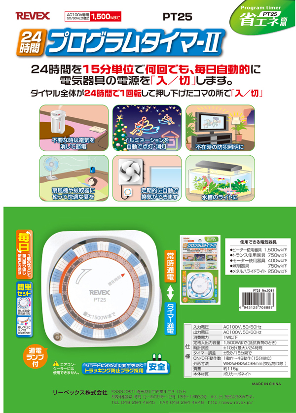 24時間を15分単位で何回でも、毎日自動的に電気器具の電源を「入/切」します。