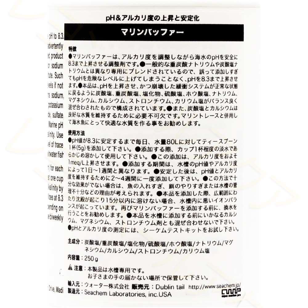 ・アルカリ度のみを上昇させたい場合はリーフビルダーをご使用ください。アルカリ度が低く、PHも低い(8.0以下)場合にマリンバッファーを使用して下さい。