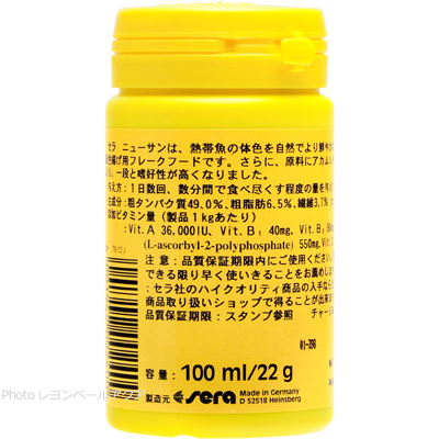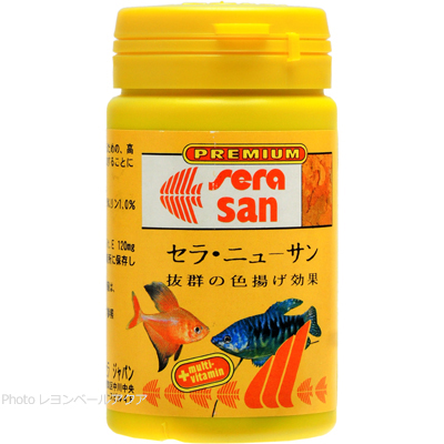 セラ ニューサンは、熱帯魚の体色を自然でより鮮やかな色彩にする色揚げ用フレークフードです。