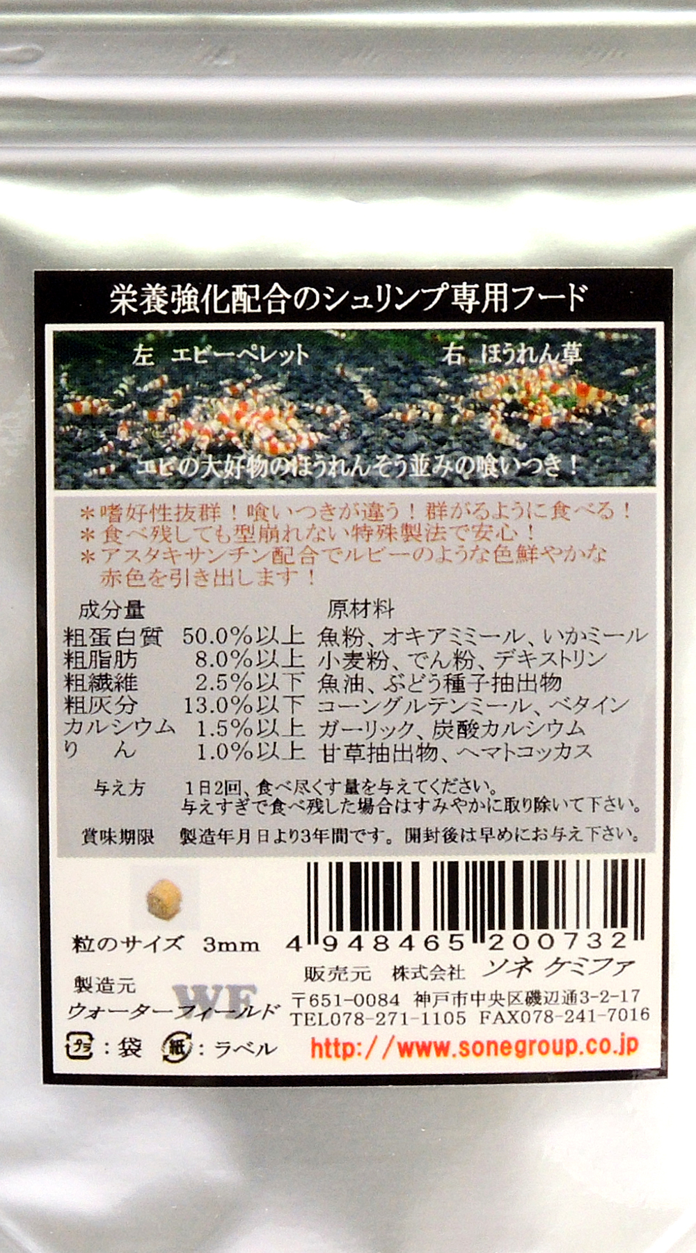 栄養強化配合のシュリンプ専用フード。食べ残しても型崩れしない特殊製法で安心してご利用いただけます。