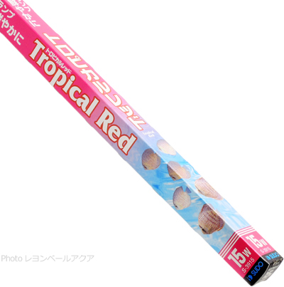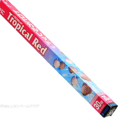 水草水槽に、赤色を鮮やかに鑑賞する蛍光ランプです。多くの植物育成用蛍光ランプが青から青緑色の400~550nm付近までの幅広い範囲の光を放出するのに対し、トロピカルレッドは水草の生長に有効な青色の波長440nmを残しながら藻類発生の原因といわれる450~520nm付近の波長を大幅にカット。また魚体色のピンク~赤色を強調させ、ディスカスやグッピーなどの赤い体色をより美しく鑑賞することが可能です。
