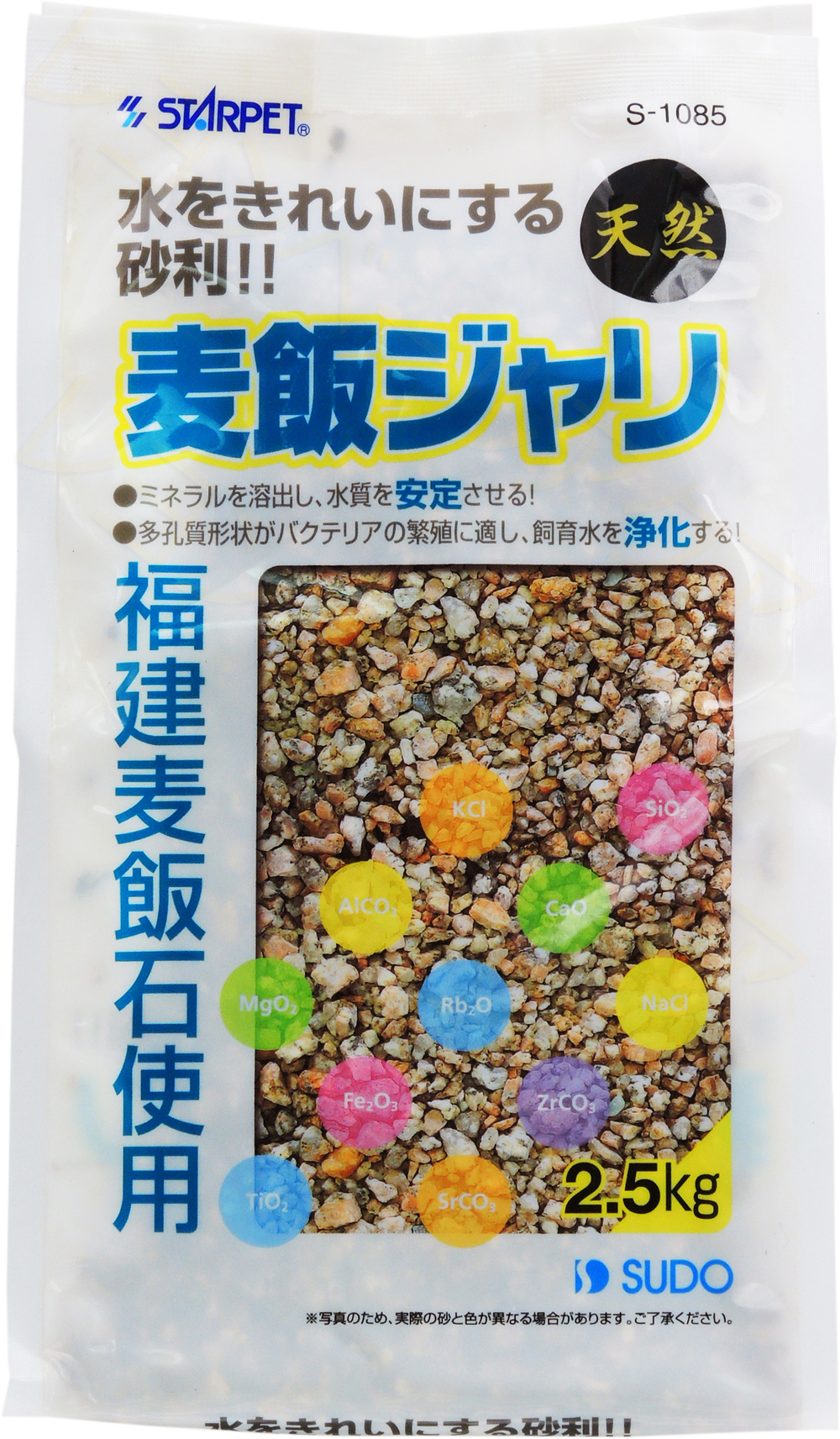 麦飯ジャリは、ミネラルを溶出し、水質を安定させるとともに、バクテリアの繁殖に適した多孔質形状が不純物を捉え、水質を浄化します。