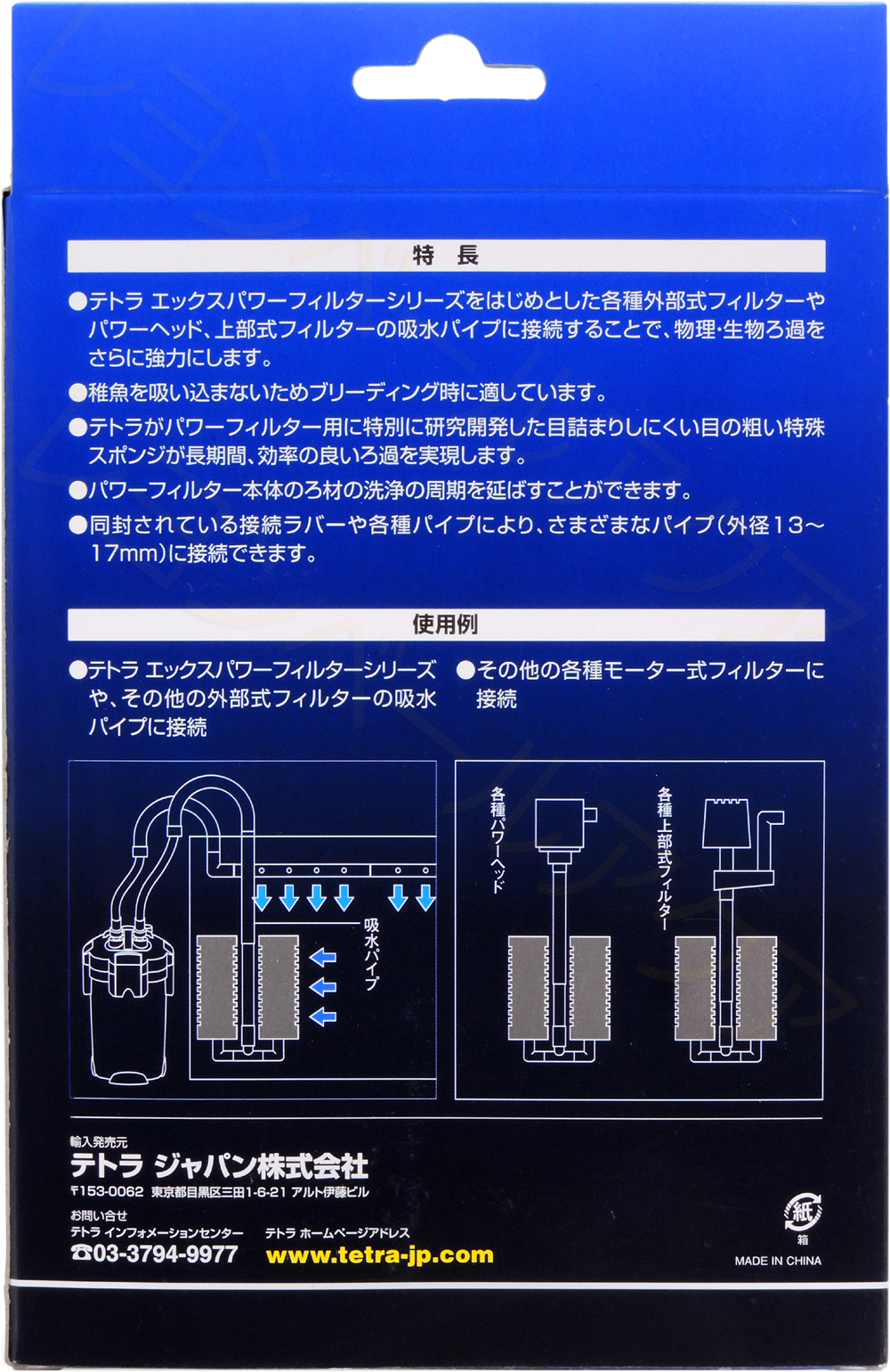 テトラ エックスパワーフィルターをはじめとした各種外部式フィルターやパワーヘッド、上部式フィルターの吸水パイプなどに接続し、さらに強力な生物ろ過が実現できる接続用フィルターシステムです。また替えスポンジはテトラワンタッチフィルターOT45/OT60にも装着可能です。お好みの長さにパイプをカットしてご使用ください。