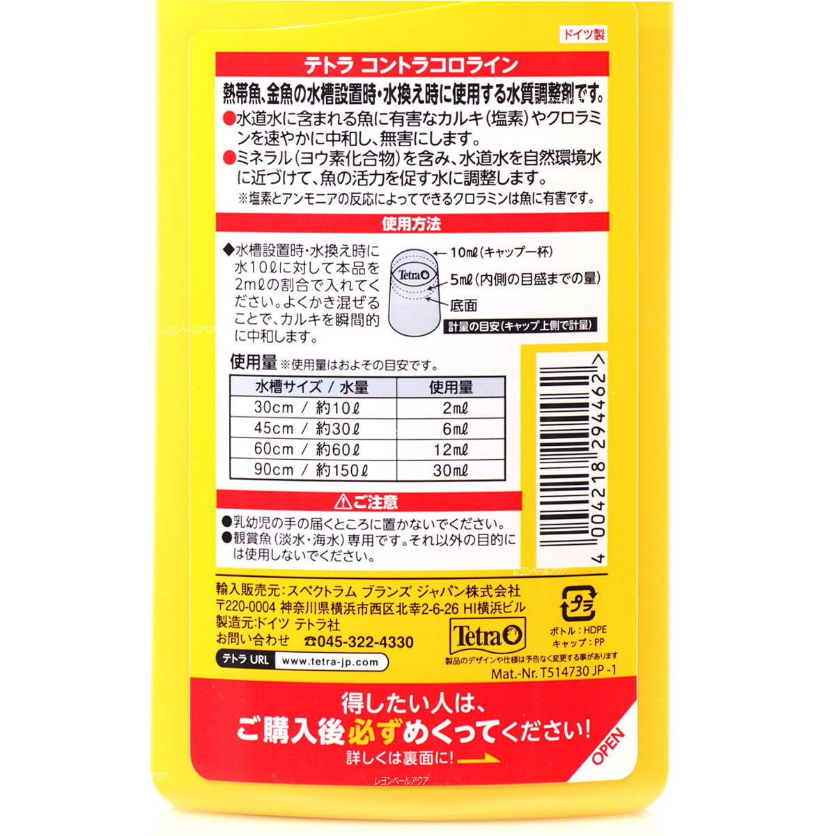 テトラ コントラコロラインは、魚に有害な水道水のカルキ(塩素)やクロラミンを速やかに中和し無害にする力を持っています。
